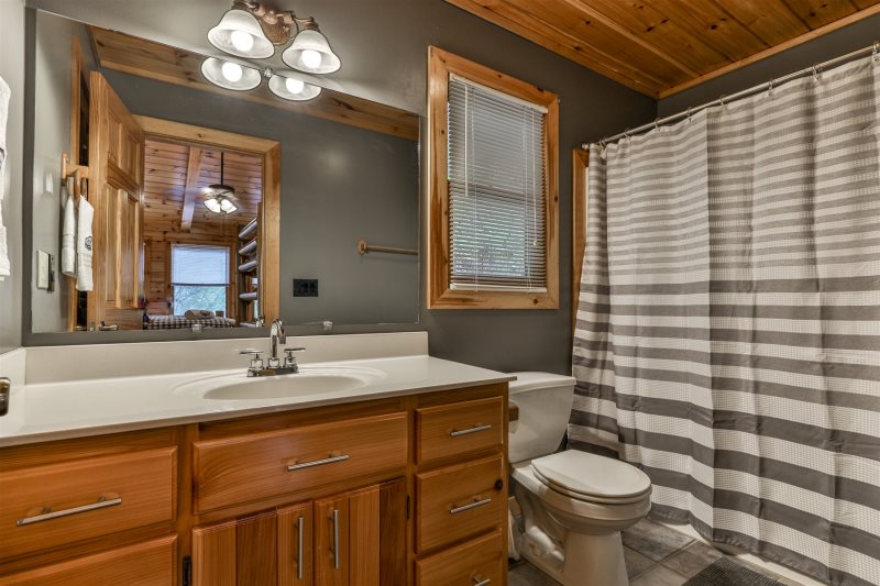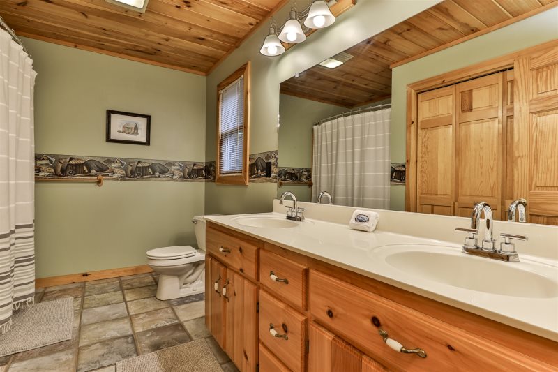 On the lower level, a bedroom with a double bunk sits near the game room, giving night owls their own hangout zone. With three full baths total—one on each level—everyone enjoys space and privacy.