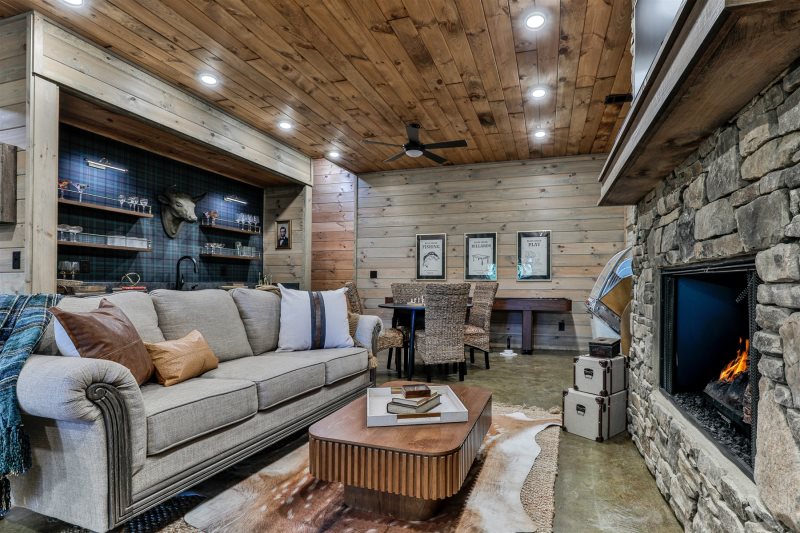 Downstairs, laughter fills the game room where a pool table, shuffleboard, and jukebox bring out everyone’s playful side. Challenge your crew to a tournament while music hums in the background, or settle into the cozy sectional by the stone fireplace to catch a movie or cheer on your team. A kitchenette with beverage coolers keeps snacks and drinks close for game nights that last well past sunset.
