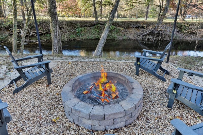 The home offers Wi-Fi, smart TVs, a washer and dryer, and ample parking for multiple vehicles. Climate control ensures comfort in every season—whether you’re cozying up by the fire in winter or enjoying lazy summer afternoons by the creek.