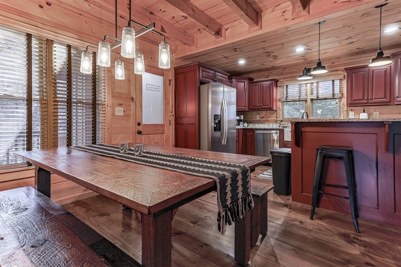 From here, the cabin flows easily toward the kitchen and dining spaces, keeping everyone connected whether you’re cooking, playing games, or winding down after a day of exploring Ellijay. It’s a serene, comfortable environment that feels instantly like home.