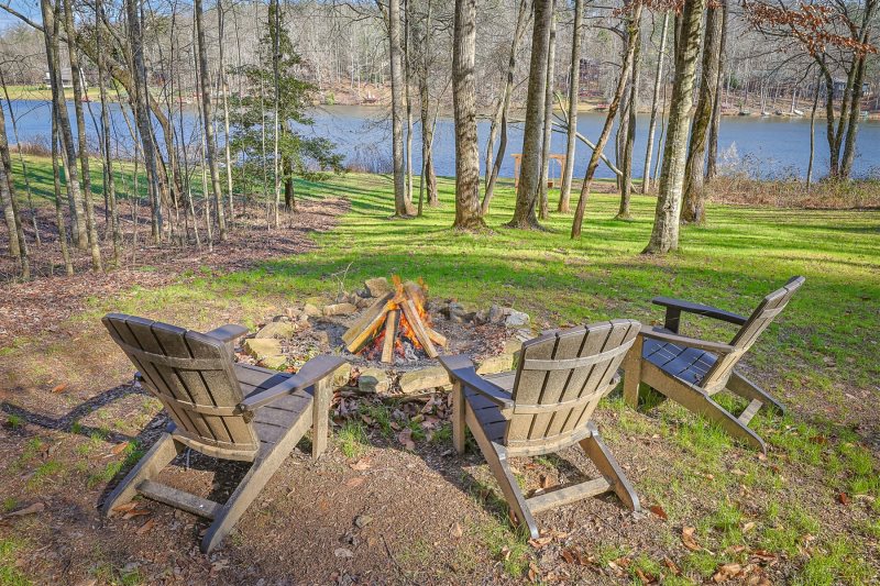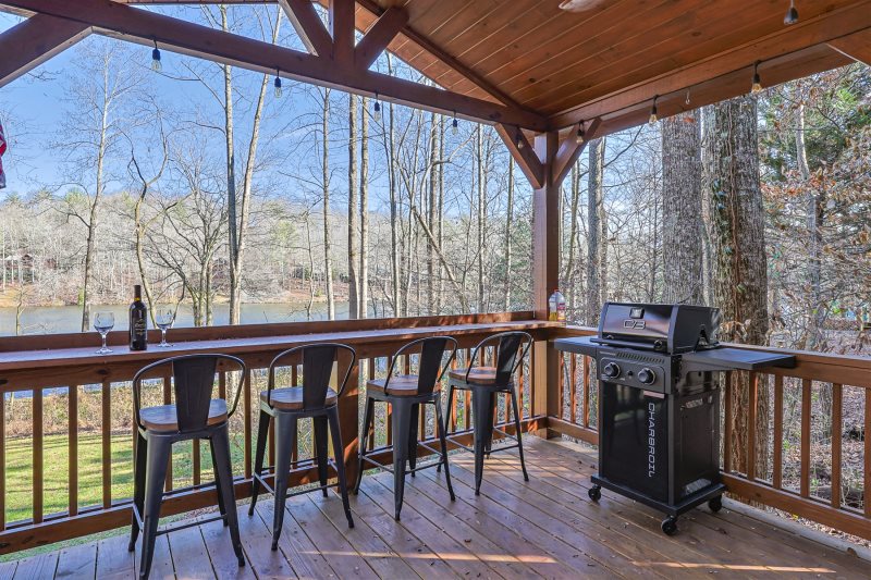 A short walkway leads to the covered hot tub overlooking the lake, where you can soak under the breeze and hear the water just beyond the trees. A gas grill and bar seating for four make cookouts easy and fun. Down a small set of steps, the fenced yard welcomes your pets and gives everyone room to relax.