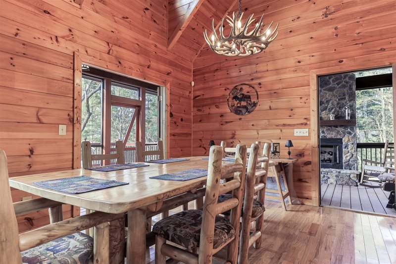 Just beyond, the lodge-style dining table brings a true mountain feel to shared meals. Whether you're enjoying a home-cooked dinner or takeout from downtown Blue Ridge, this space encourages guests to slow down, gather, and enjoy time together.