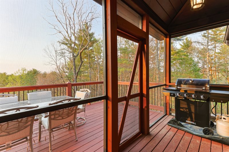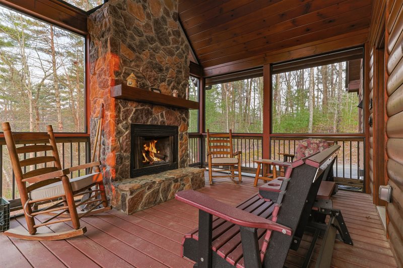 The screened porch offers a fireplace, comfortable seating, and a gas grill, creating a second living space outdoors.