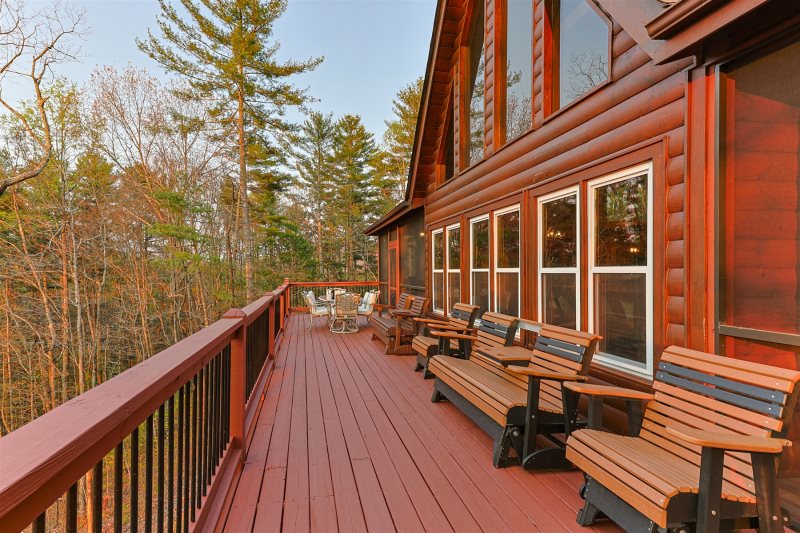 The main deck features both dining and lounging areas, perfectly positioned to take in the sweeping mountain views.